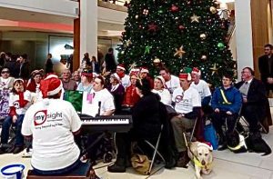 Photo shows members of our visually impaired choir (many with their guide dogs and some wearing Santa hats and My Sight Notts tee shirts) singing beside a beautifully decorated Christmas tree