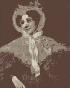 Photo shows a black and white image of a painting of Mary Chambers. She is wearing a white lace bonnet tied under her chin with ribbon and a pair of spectacles