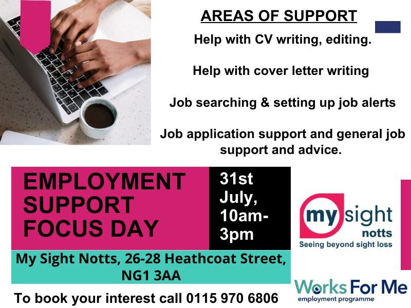 My Sight Notts will be hosting a series of employment support focus days, in which members of the My Sight Notts team will be on hand to help deliver support and advice regarding employment and volunteering.