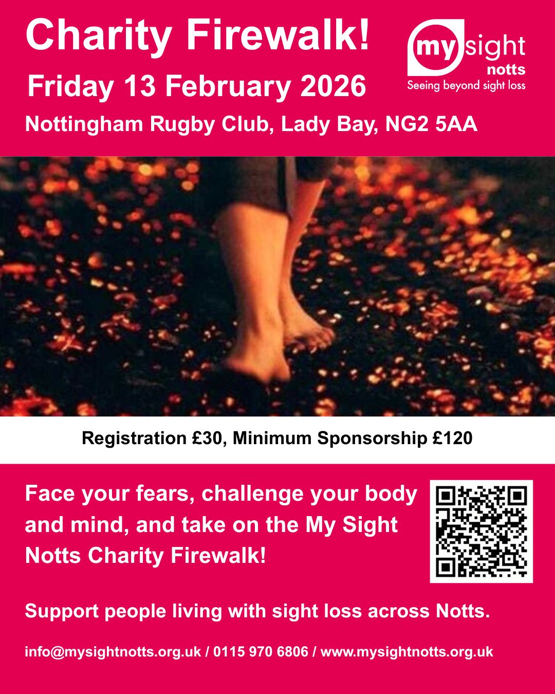 Join My Sight Notts on Friday 13th February 2026 at Nottingham Rugby Club for our Charity Firewalk and help raise vital funds to support people with sight loss across Nottinghamshire.