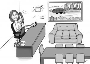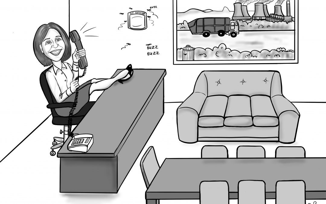Image shows Illustration from Amanda Harris’ book She Will Never shows a drawing of a smiling business woman sitting on an office chair with her feet up on the desk with a telephone in her hand. Her office looks quite plush, with a large meeting table and comfy sofa on one side and from the window you can see a power station
