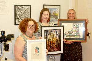 Photo 1 shows Julie from My Sight Notts holding up a painting of a highly decorative boot, Sarah from Wildgoose Designs holding up her textile art and Steph from Charles Lea who is seated next to optometrist’s eye testing equipment holding a photo of a woodland scene