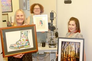 Photo 2 shows Sarah Steph and Julie each holding the same works of art but in this picture they are standing in front of other paintings in the opticians gallery