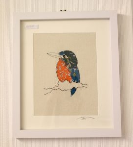 Photo 3 shows a textile art of a beautiful Kingfisher with an orange breast and gorgeous teal tail feathers created by local artist, Sarah
