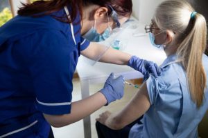 Photo shows a young woman wearing glasses and a face mask being vaccinated by a nurse.