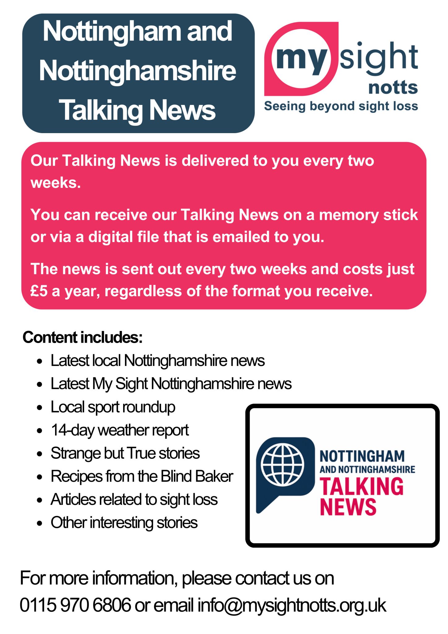 For more information or to register for the talking news please contact Sarah Briggs, Sight Loss Advisor, on 0115 9706806 or email sarahb@mysightnotts.org.uk